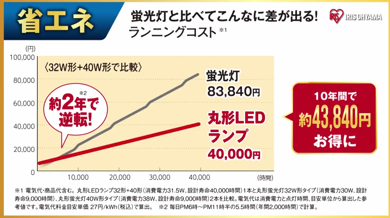 もう一つ複雑な理由がアイリスオーヤマの丸型LEDランプは「丸型LEDランプ1本で今使っている丸型蛍光灯2本分の明るさ」が商品の売りです。