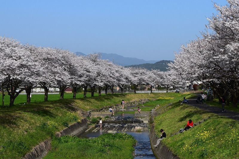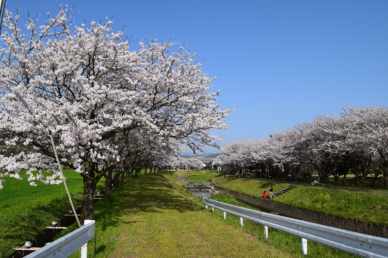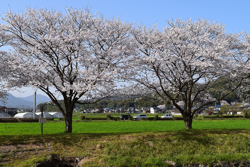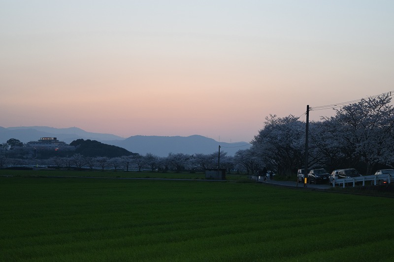 これがうまい! そこから2~3分のところにある 「道の駅 朝倉」 三連水車があります。 18:00 そこからまた花見の場所へ行き夕暮れの花見 綺麗だ。 20:00 一般道で40分くらいで福岡市内へ戻り、ブックオフに行って、ガストでお持ち帰りして帰宅。